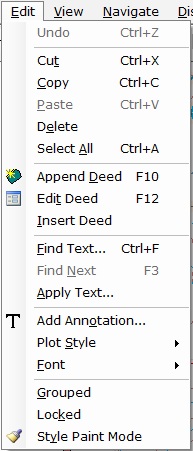 Deletes selected deed(s) or text from the deed file and moves it to the Windows clipboard, replacing whatever was on the clipboard. This command is unavailable if nothing is currently selected. |