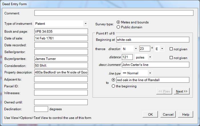 If the deed has a metes and bounds survey description you will enter each point of the survey individually, taking the information from the deed itself. In the example above, the survey begins at a white oak tree and then runs North 23 degrees East for 121 poles. The survey line travels along the property line of John Carter (but it could have just as well been “crossing Rabbit Creek”, or other similar information). The line is a normal survey line, not a meander (water) line or unapproved conditional line. The survey line ends at a tree in the line of a Randall. After completing this line the Next button is pressed to allow the entry of the next line of the survey. This continues until all points and lines have been described and “to the beginning” is selected. When deed entry is complete you press the OK button to have the deed data added to the deed file. You should see the new deed in the center of the Plot View.